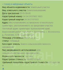 СРОЧНО ПРОДАЁТСЯ! Земельный участок 11 соток в ДНТ Ермолаевское-2Идеальное место для вашего дома или дачи мечты! Местоположение:Красноярский край, Берёзовский район, Есаульский сельсовет,ДНТ Ермолаевское-2, ул. Полевая, участок 67. (24:04:0301001:2360) Добраться — одно удовольствие!По живописной трассе через мост 777. О участке:Площадь — 11 соток, участок ровный и ухоженныйЖивописное окружение: задняя граница примыкает к лесополосе — никакой дороги и соседей за заборомНа участке — берёзы, ели, кедры — создают уют и тень, не мешая застройкеЭлектричество по улице, соседи живут круглогодично (70 тысяч стоит подключение, возможно 3 фазы на участок)Подъезд круглогодичный, дороги отсыпаныДо Енисея — всего 800 метров, рядом карьер для купания и отдыха- (По взносам 3000 руб/год если используется участок под дачу, 6000 руб/год если используется постоянно)- Скважина начинается от 10 метров и глубже Документы готовы! Один взрослый собственник.Участок идеально подходит под строительство дома, дачи или инвестицию — место активно застраивается! Проведу сделку под ключ — от проверки документов до ипотеки.Помогу также спроектировать и построить дом вашей мечты! Звоните прямо сейчас — участок стоит вашего внимания!Дополнительно оплачивается комиссия с покупателя.Комиссия на покупку данного типа недвижимости:- при стоимости объекта недвижимости до 8 000 000 рублей составляет 20 000 рублей + 2% от стоимости объекта недвижимости, но не менее 50 000 рублей при работе со специалистом по недвижимости,- при стоимости объекта недвижимости от 8 000 000 рублей составляет 2% от стоимости объекта недвижимости при работе со специалистом по недвижимости,- при стоимости объекта недвижимости до 8 000 000 рублей составляет 30 000 рублей + 2% от стоимости объекта недвижимости, но не менее 50 000 рублей при работе с экспертом по недвижимости,- при стоимости объекта недвижимости от 8 000 000 рублей составляет 10 000 рублей + 2% от стоимости объекта недвижимости при работе с экспертом по недвижимости,Сделки с агентствами по недвижимости происходят на основании ''Соглашения о совместной сделке''.Код пользователя: 175619Номер в базе: 6039544