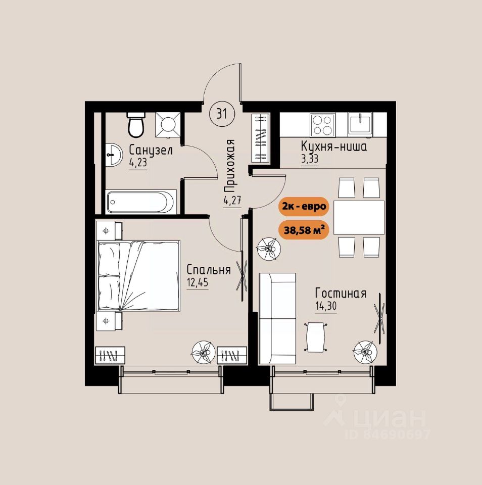 35 м² · Этаж 14 из 17