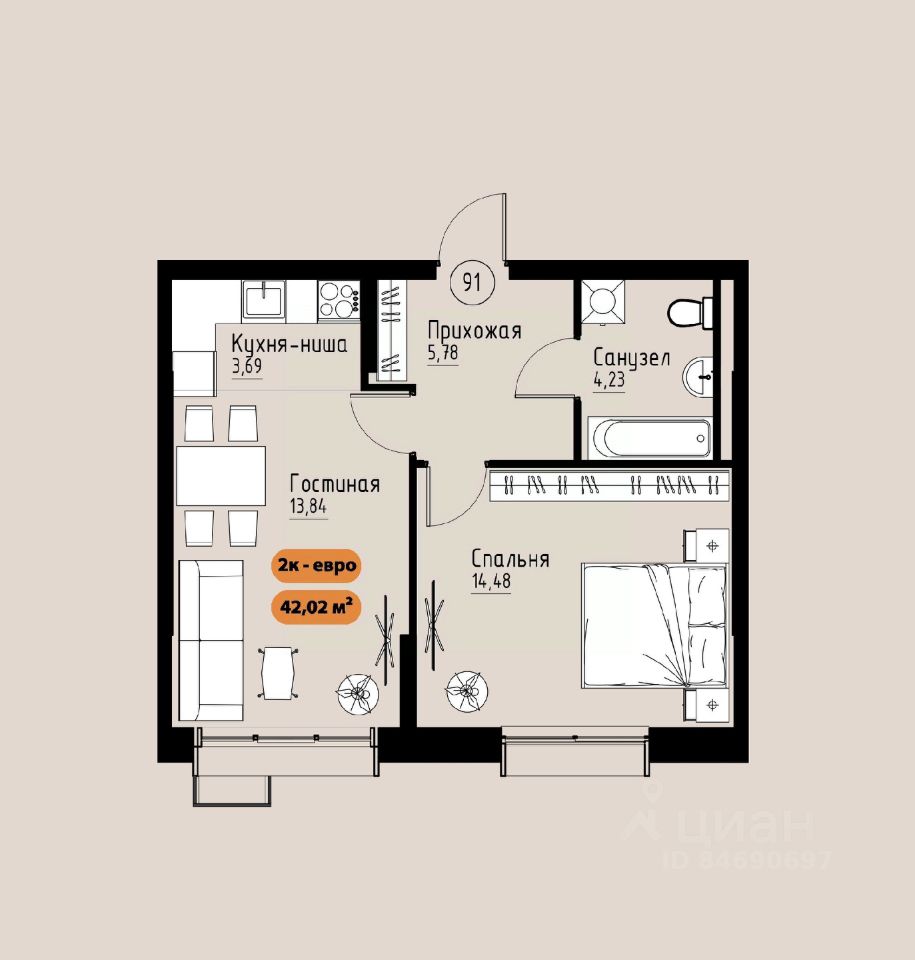 42 м² · Этаж 9 из 17
