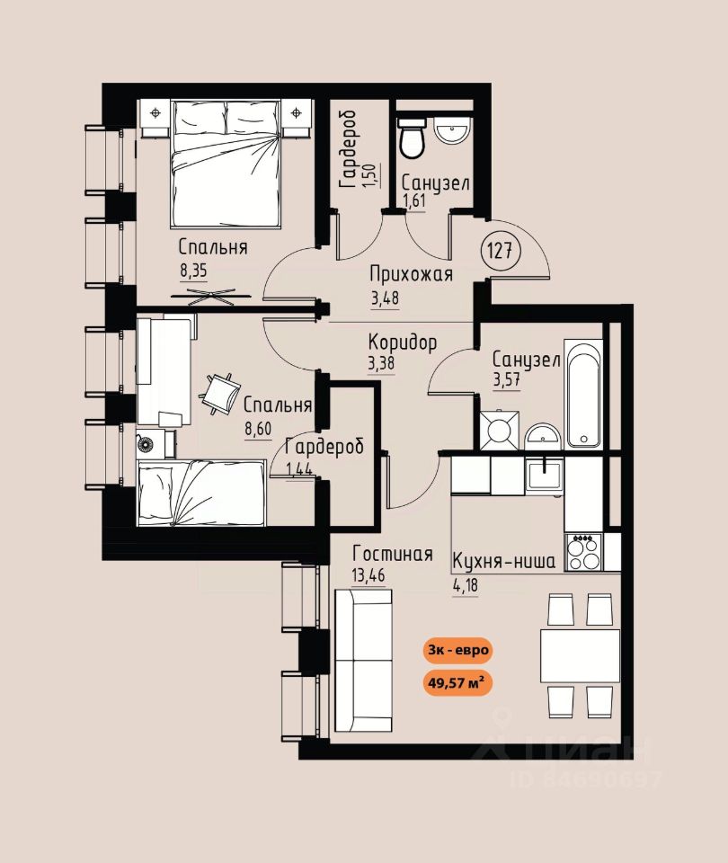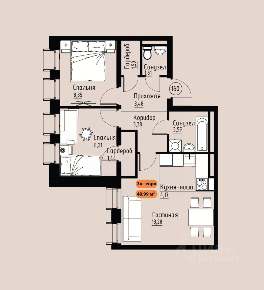 49 м² · Этаж 14 из 17