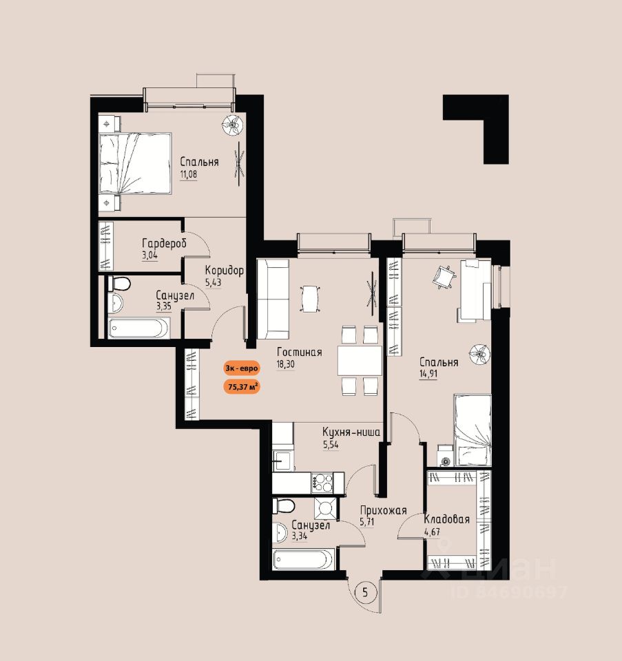 75 м² · Этаж 3 из 17