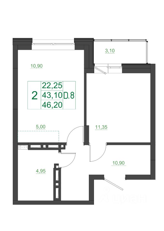43 м² · Этаж 11 из 21