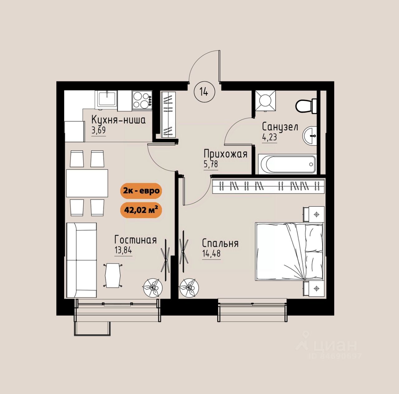 42 м² · Этаж 13 из 17