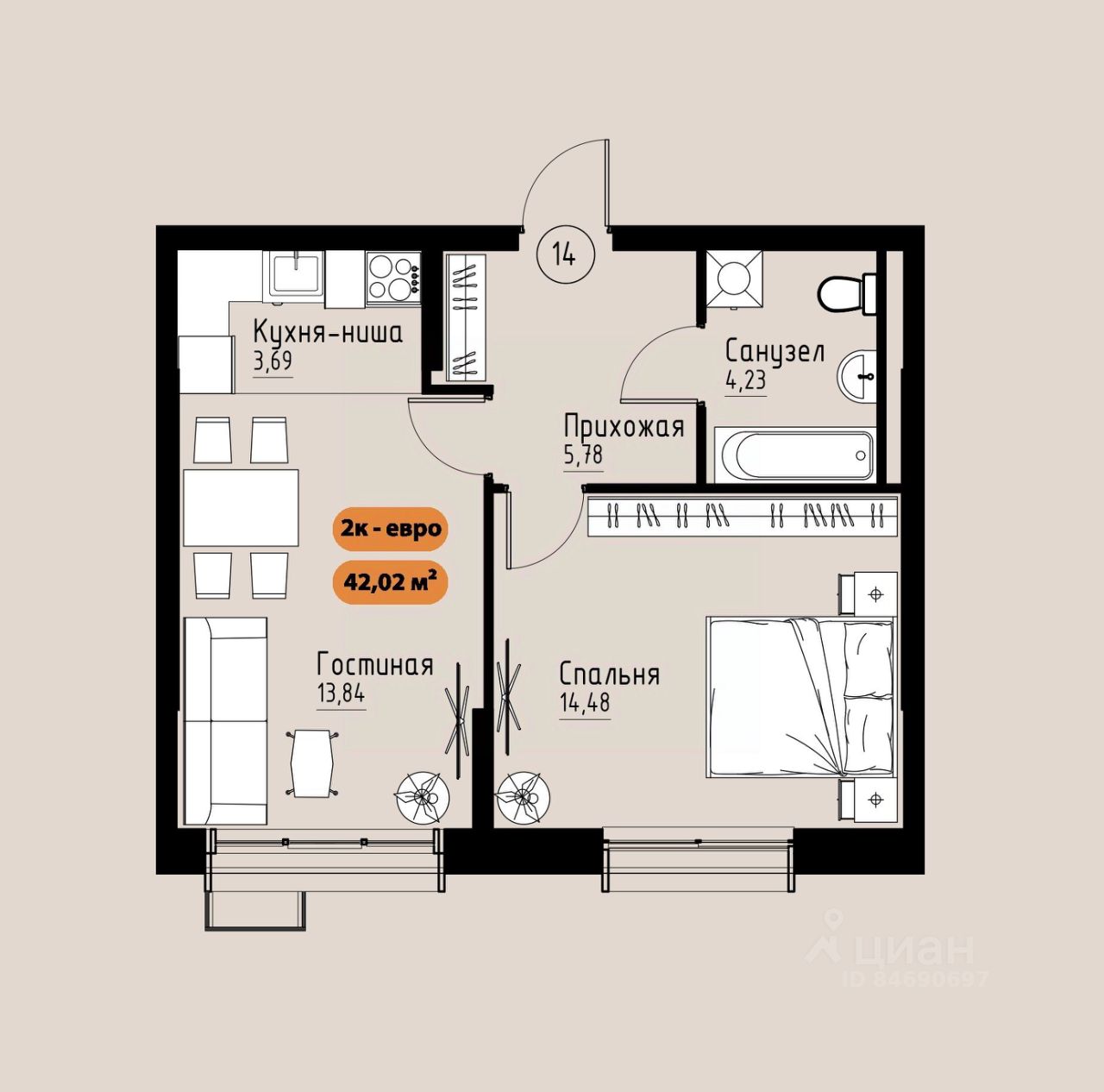42 м² · Этаж 14 из 17