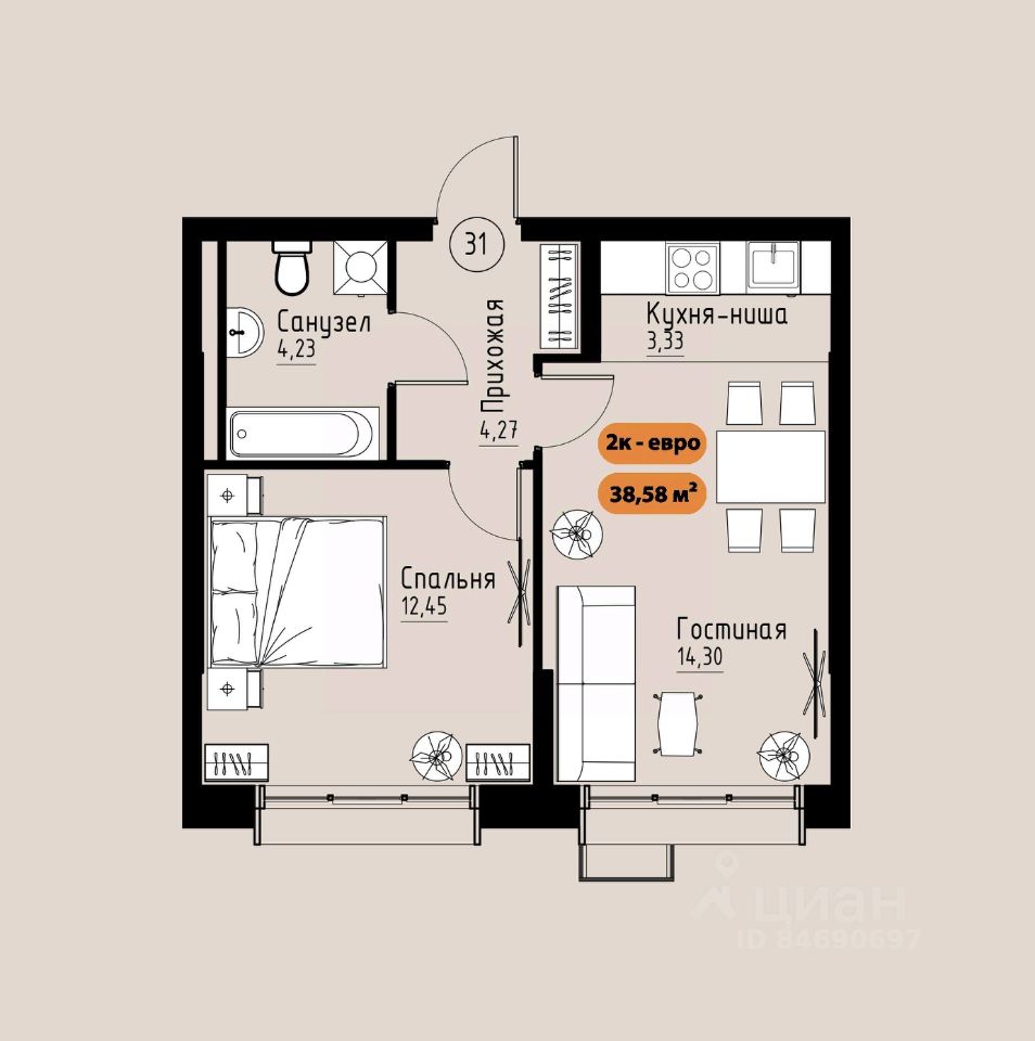38 м² · Этаж 15 из 17