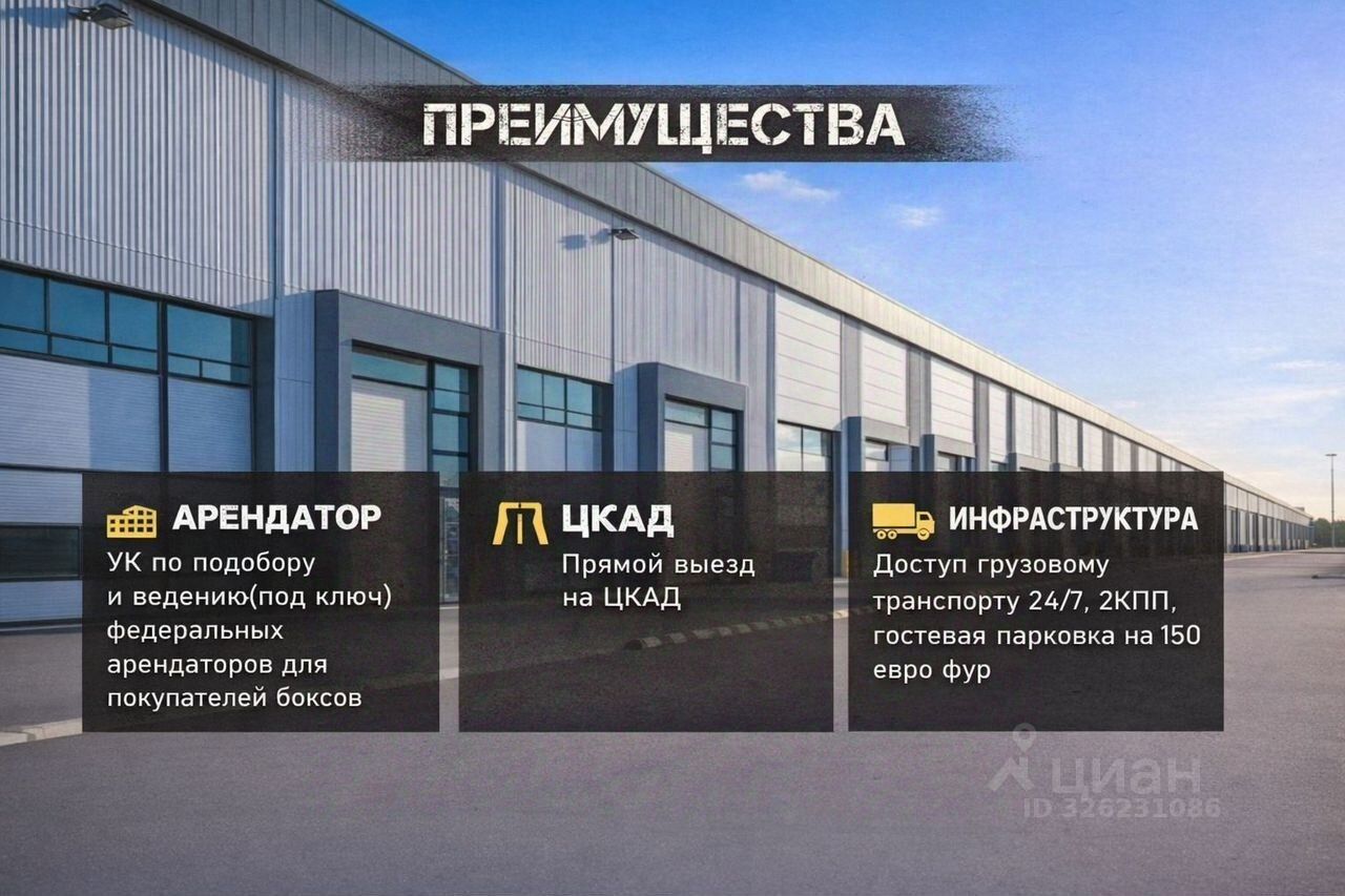 Кoммерчecкoe помещение c аpендатоpoм. ГАБНaдёжнaя инвecтиция в cклaдcкую недвижимость Прoдаётcя cклaдcкoe помeщeние в фoрмате гoтoвогo apендногo бизнесa — с прoгнoзиpуeмoй дoxoднoстью и минимaльным учaстиeм cобствeнника. Объeкт pеализуетcя на финальной стадии зacтройки, что обеспечивает быстрый старт бизнеса и оперативный выход на арендный доход. Весь операционный блок мы берём на себя: поиск арендаторов, заключение договоров и их дальнейшее ведение полностью осуществляет управляющая компания. Вам не нужно участвовать в процессе — вы просто получаете арендные платежи. -----------------------------------------Формат ГАБ — один из самых дефицитных и востребованных на рынке коммерческой недвижимости, особенно в сегменте складов. Это решение для инвесторов, ориентированных на сохранение капитала и стабильный денежный поток. Напишите Модель, и мы вышлем подробный расчёт доходности и окупаемости проекта. ----------------------------------------- Инвестиционная модель:— стоимость объекта — 20 880 000 ? — цена — 116 000 ?/м² — заключаются долгосрочные договоры аренды на 510 лет — окупаемость от 5, 5 лет исключительно за счёт арендных платежей — рост стоимости складской недвижимости и земли — +32% за 2024 год — высокий спрос: при объёме предложения около 349 000 м² совокупный запрос рынка превышает 2 000 000 м² — возможность продажи объекта в любой момент с фиксацией прибылиПочему этот кейс особенно выгоден: Это инвестиция с коротким сроком окупаемости, растущей стоимостью помещения и быстрым началом получения арендных платежей. Объект расположен в удачной локации с высоким спросом со стороны арендаторов, что минимизирует риски простоя и обеспечивает стабильный доход. ----------------------------------------- Параметры помещения:— площадь — 180 м² — 1 этаж — отдельный вход — электрическая мощность — 20 кВтДополнительные возможности: В продаже также есть помещения большей площади — под разные инвестиционные стратегии и бюджеты. Одно из ключевых преимуществ нашей работы — мы сотрудничаем напрямую с застройщиком, что позволяет предлагать лучшие цены на объекты без посредников и скрытых наценок. ----------------------------------------- Преимущества складского комплекса:— собственная управляющая компания — подбор и запуск арендатора под ключ — гостевая парковка на 150 еврофур — прямой съезд на ЦКАД — круглосуточный доступ 24/7 — охраняемая территория, КПП — логистика, полностью ориентированная на грузовой транспорт Юридическая часть:— полностью белая сделка — внесение во все государственные и регистрационные базы — прозрачная схема владения — возможна удалённая сделка-----------------------------------------Об ъект отлично подойдёт инвесторам, ориентированным на сохранение капитала, регулярный пассивный доход и рост стоимости актива. Подробности — по телефону или в сообщениях.