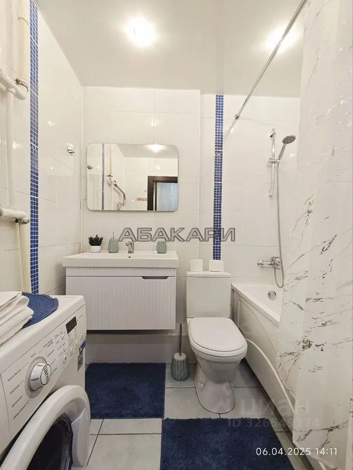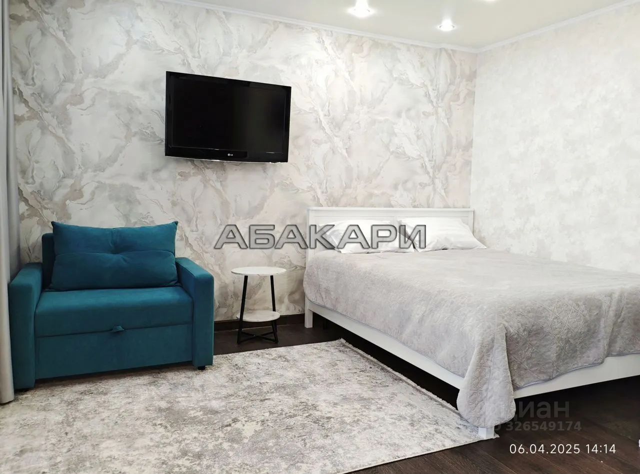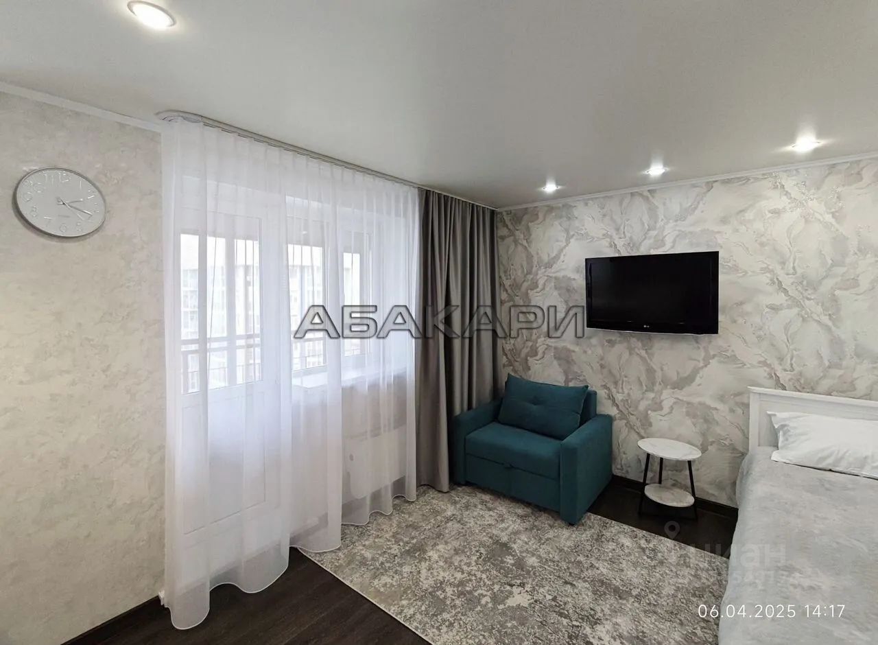 Светлая студия, есть все для проживания. Холодильник, микроволновка, стиральная машина, пылесос. Интернет проведен. Просторный балкон. Вид из окна на Енисей и на 4ый мост. Вход в подъезд с двух сторон. Во дворе большая детская площадка. Рядом детский сад. Множество парковок и магазинов на любой выбор.