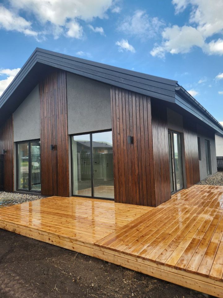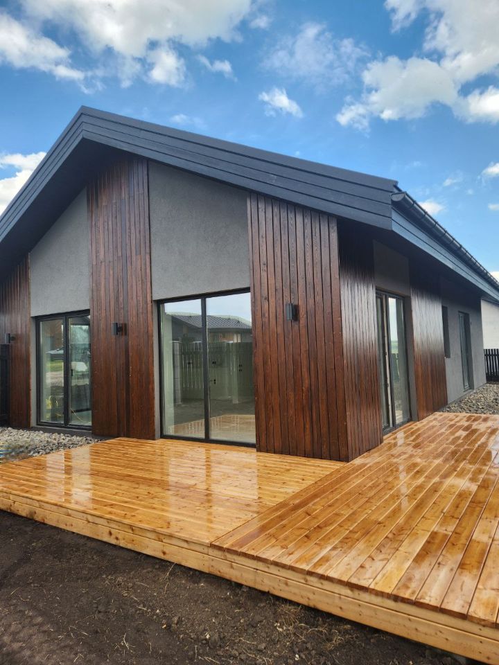 Функциональная планировка: кухня-гостиная с панорамными окнами и выходом на террасу, две комнаты свободного назначения, подходят для спальни, детской или гостиной, ванная комната с окном, прачечная комната, Надёжные и тёплые материалы для строительства: фундамент - утепленная шведская плита со встроенными коммуникациями и системой теплый водяной пол. Толщина утеплителя 200 мм., стены автоклавный газобетон ''Сибит'', толщина 400 мм, плотность блока D 350, фальцевая кровля эталон красоты для кровельных материалов с высокими показателями прочности и долговечности. Толщина утеплителя 300 мм, непромерзающая входная дверь (Финляндия), панорамные окна, профиль Rеhаu, стеклопакеты мультикомфорт,