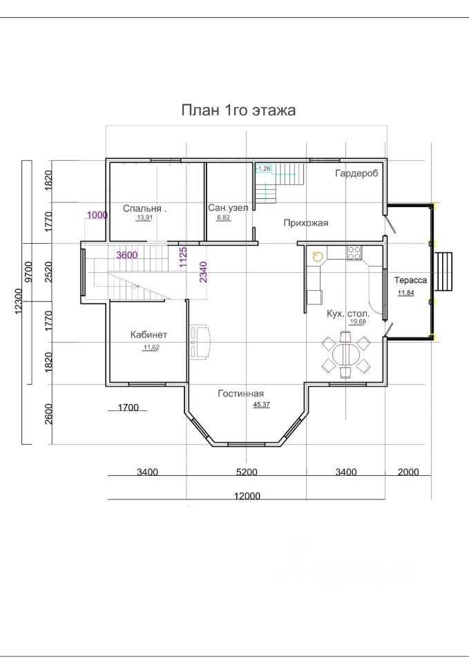 1 этаж: (высота потолков 3м)