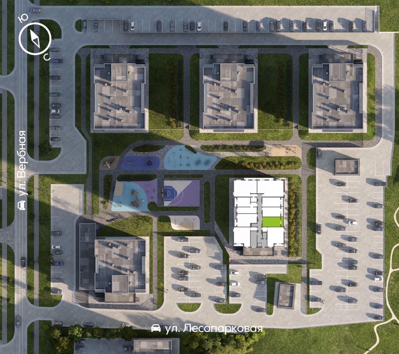 Белоснежные дома рядом с большим Эко-парком Гремячая грива. Просторные закрытые дворы, парадный вход с консьержем. Собственное уличное пространство с оживленными кафе и магазинами, необычными скамейками, зеленью и цветами, изящной подсветкой.