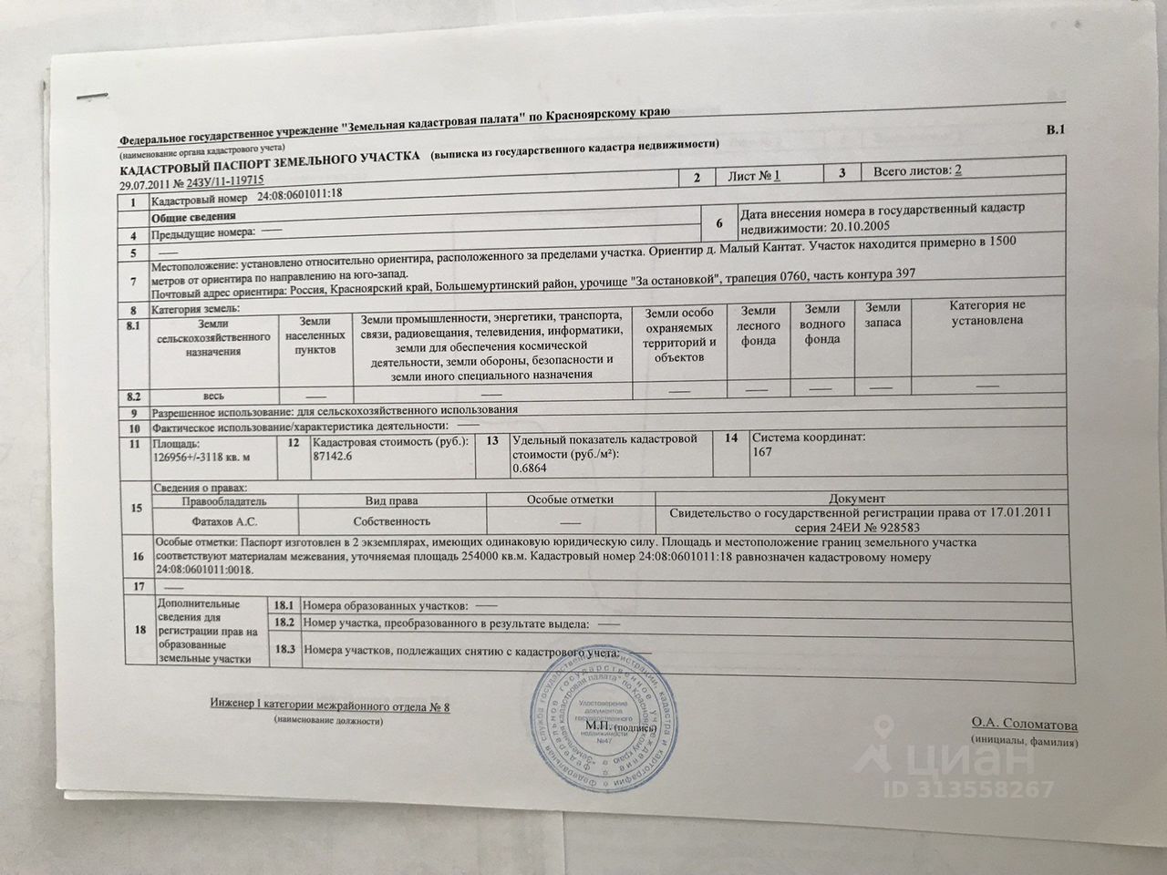 Пос. Большая Мурта. Находится около федеральной трассы. Есть линии электропередач. Площадь: по док. 12.7 га. Возможен обмен на предложенное.! 24:08:0601011:0018.