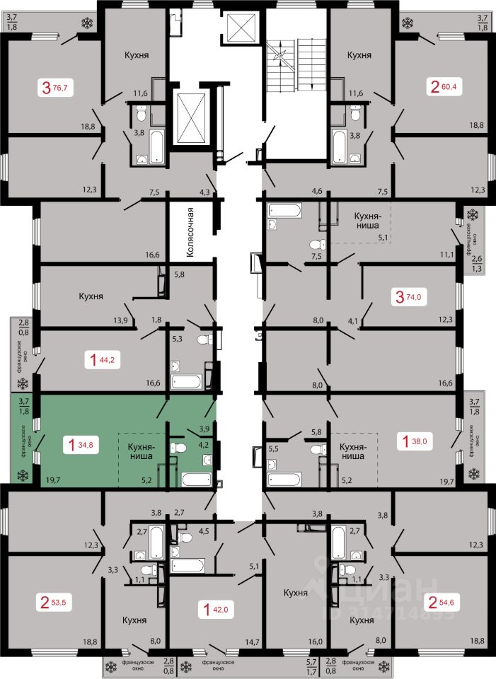 Продаётся 1-комнатная квартира в строящемся доме (Дом 2), срок сдачи: IV-кв. 2026, общей площадью 34.8 кв.м., на 14 этаже.