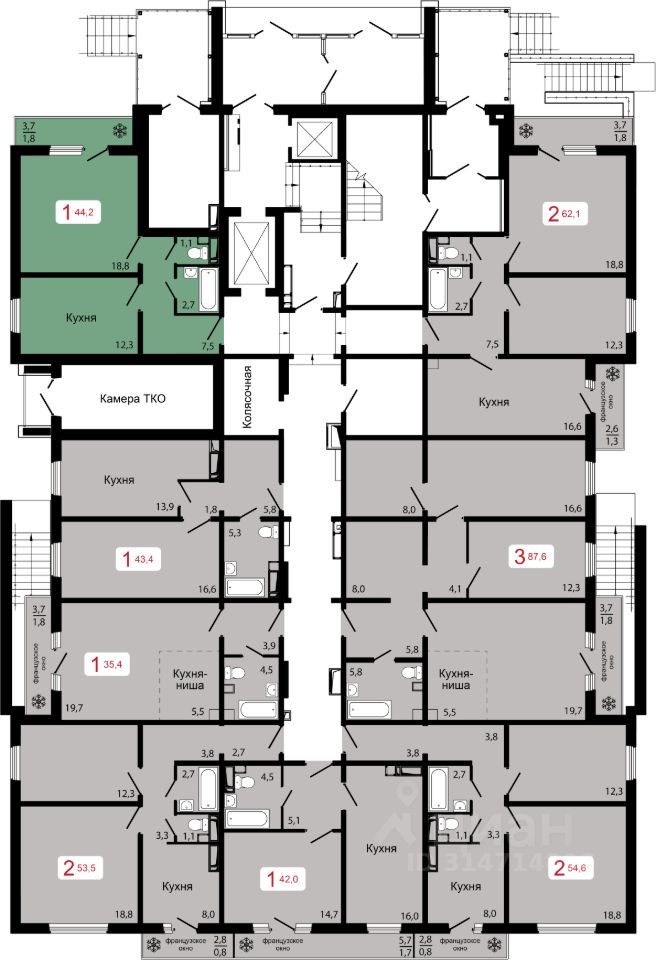 Продаётся 1-комнатная квартира в строящемся доме (Дом 2), срок сдачи: IV-кв. 2026, общей площадью 44.2 кв.м., на 14 этаже.