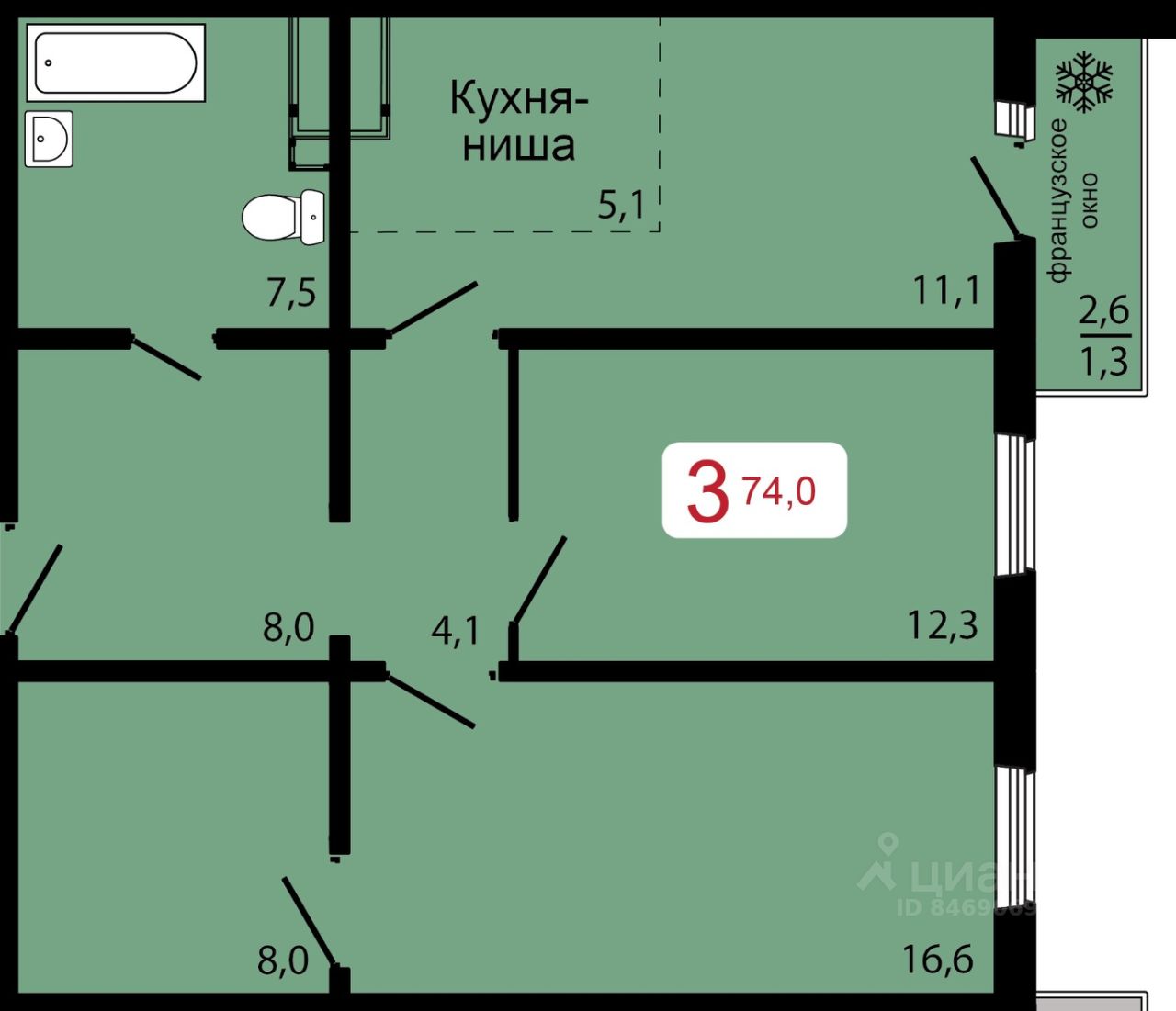 Продаётся 3-комнатная квартира в строящемся доме (Дом 2), срок сдачи: IV-кв. 2026, общей площадью 74 кв.м., на 15 этаже.