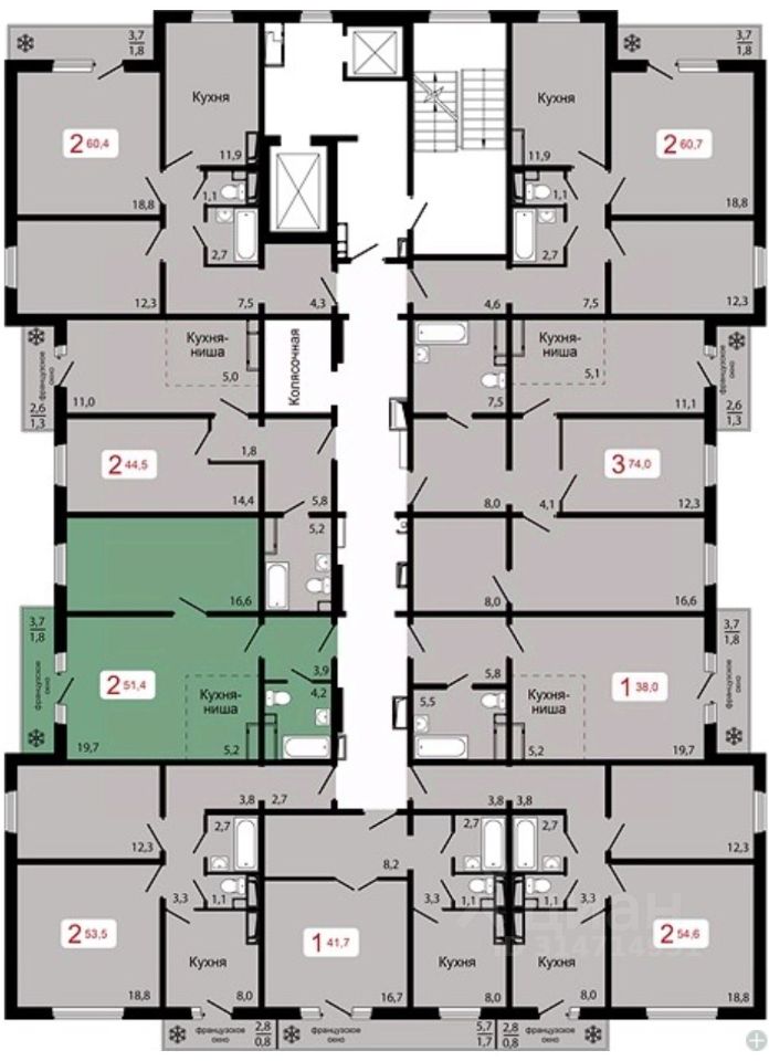 Продаётся 2-комнатная квартира в строящемся доме (Дом 1), срок сдачи: IV-кв. 2026, общей площадью 51.4 кв.м., на 2 этаже.