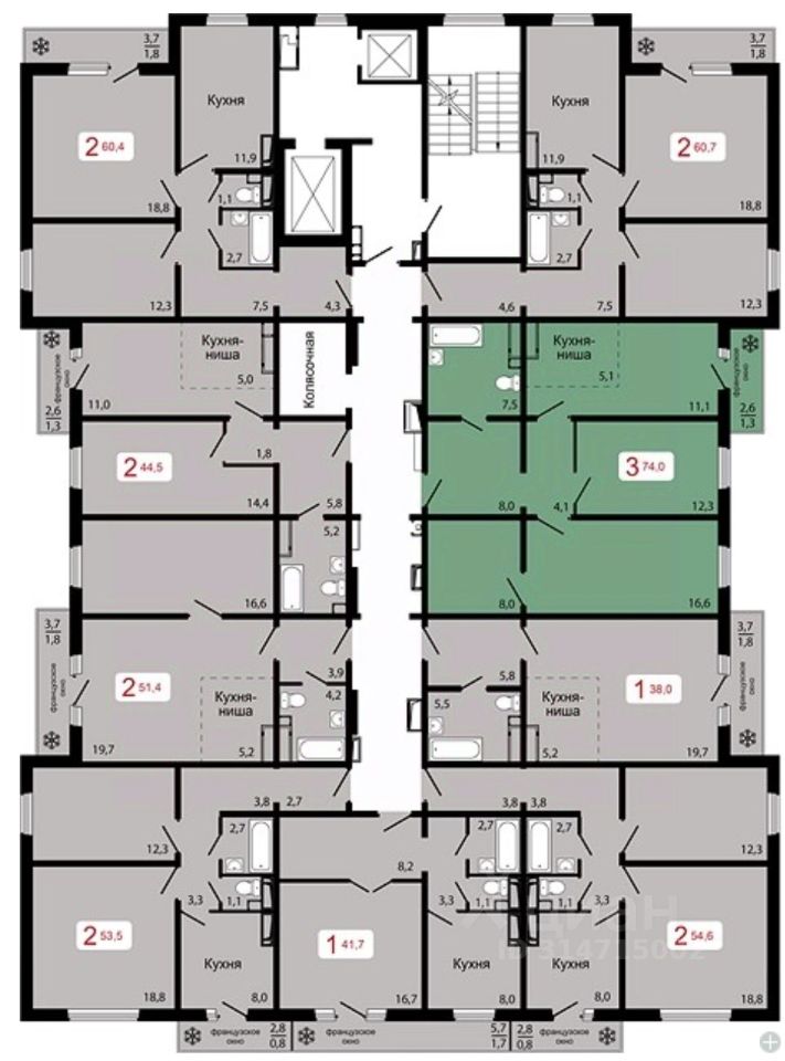 Продаётся 3-комнатная квартира в строящемся доме (Дом 1), срок сдачи: IV-кв. 2026, общей площадью 74 кв.м., на 6 этаже.
