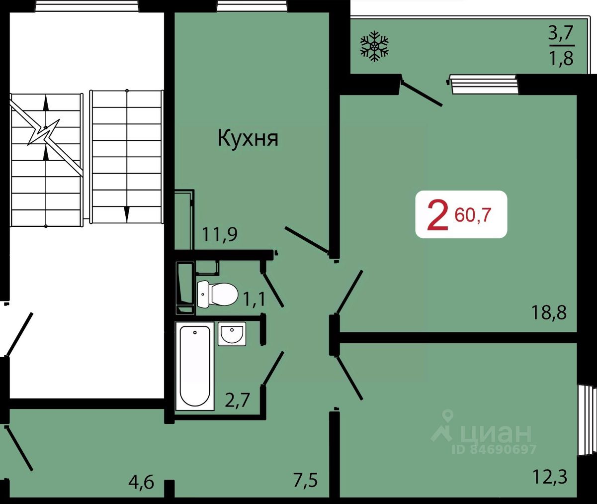 Продаётся 2-комнатная квартира в строящемся доме (Дом 1), срок сдачи: IV-кв. 2026, общей площадью 60.7 кв.м., на 14 этаже.