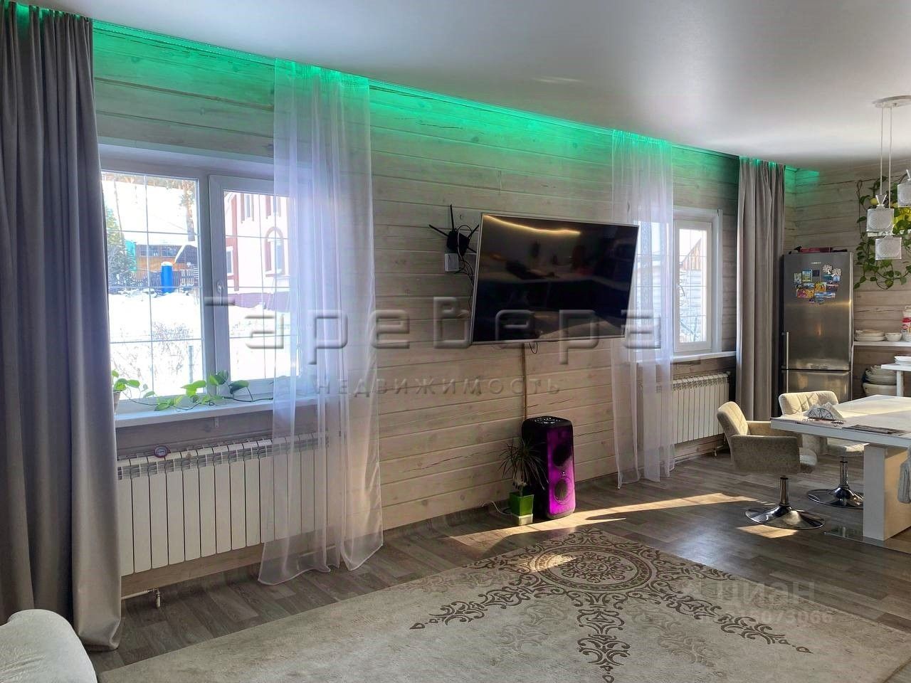 В доме, на 1 этаже, площадью 95м: - Прихожая с терморазрывной дверью, шкафом-купе с зеркальными дверцами - Просторная кухня-гостиная 9м*4м=36м - Санузел, водяные теплые полы, 4м*4м=16м - Окна ПВХ, натяжной потолок, белый с матовым точечным освещением - Высота 2,85м