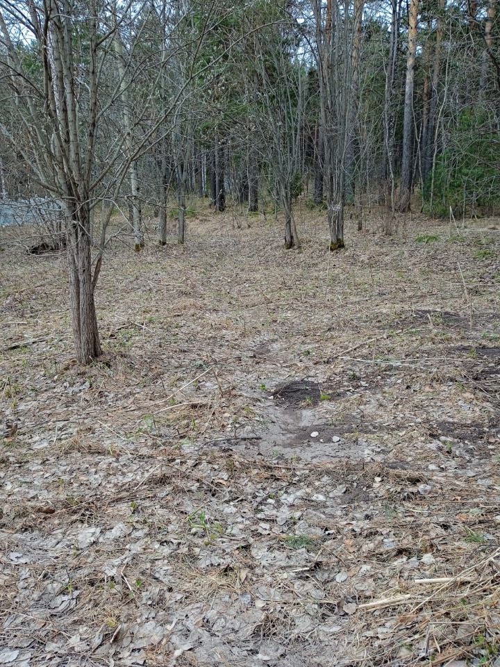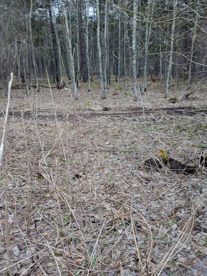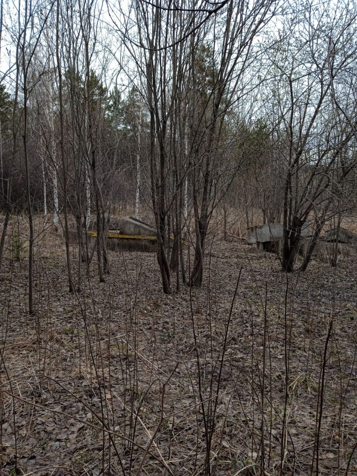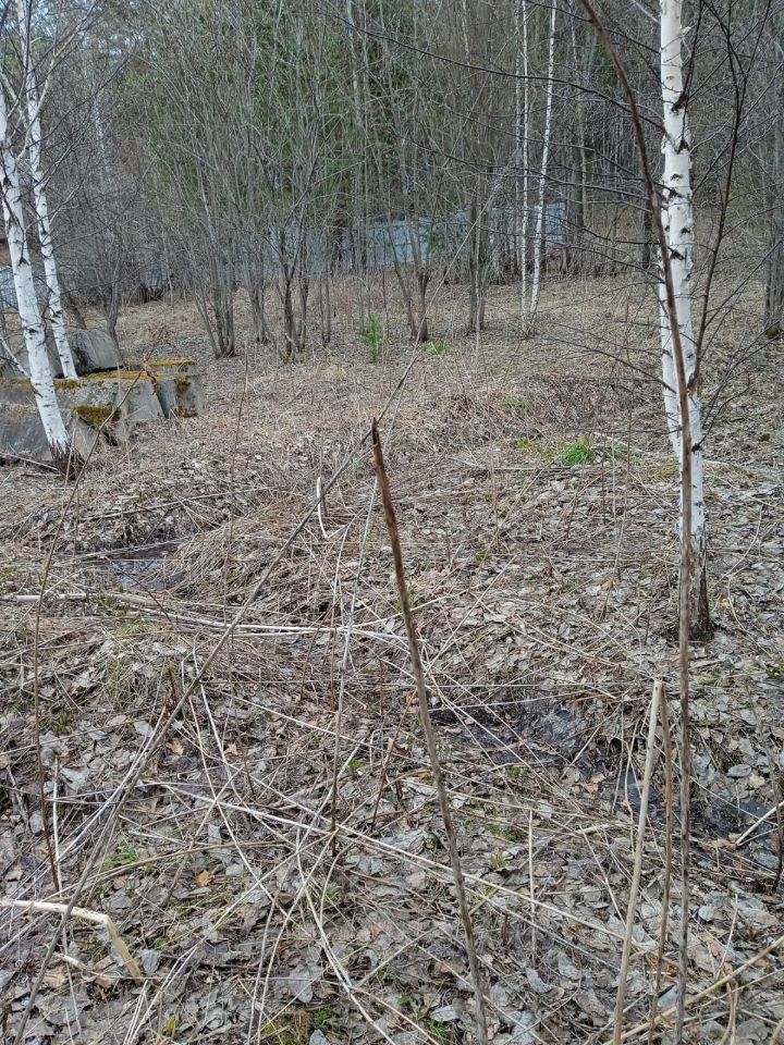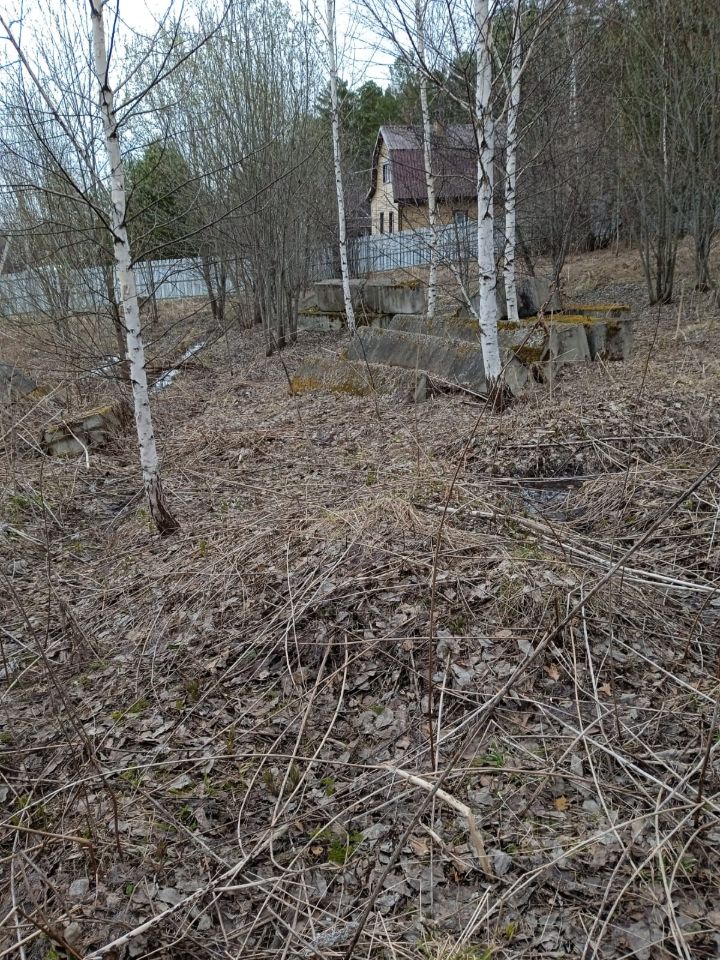 На участке складированы большие бетонные блоки для обустройства фундамента под строительство дома.