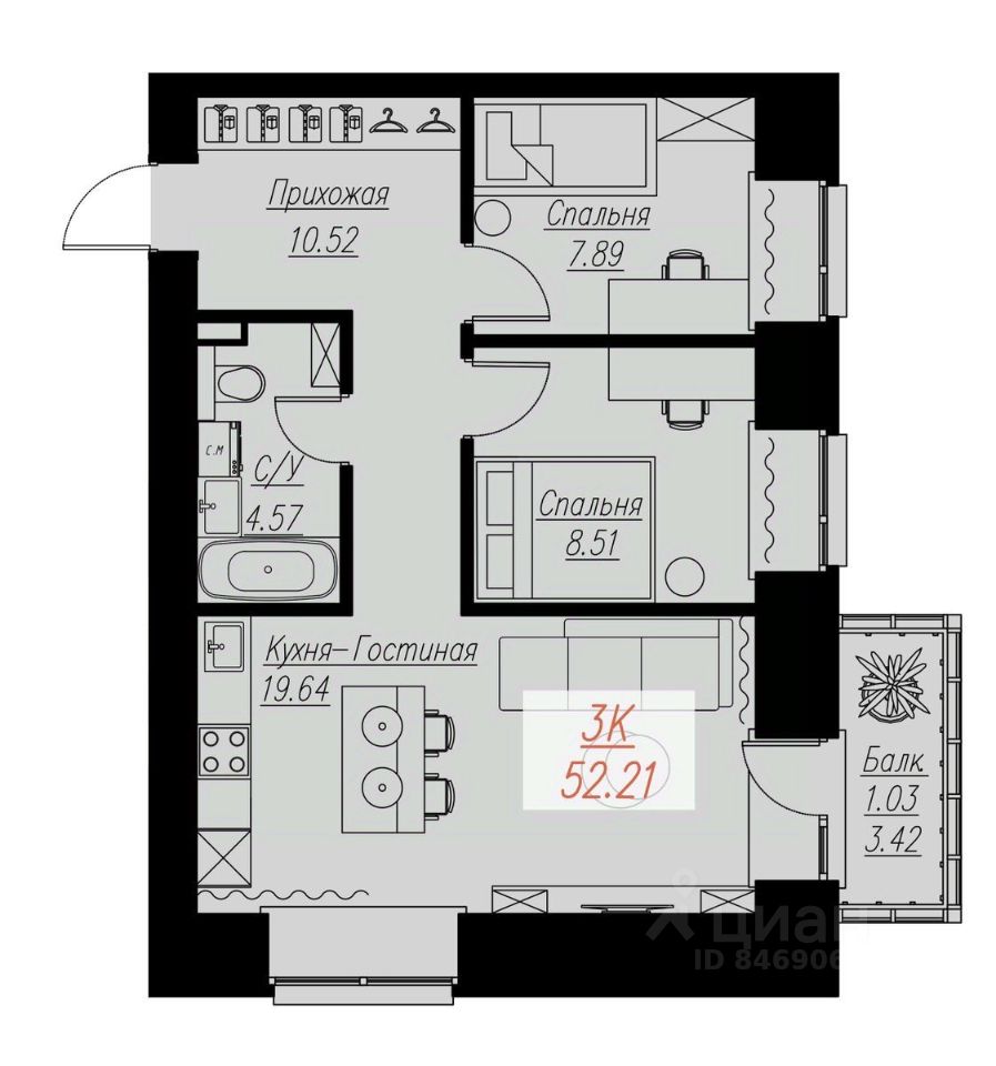 Продаётся 3-комнатная квартира в строящемся доме (Дом 2 Корпус 1), срок сдачи: I-кв. 2026, общей площадью 52.21 кв.м., на 11 этаже.