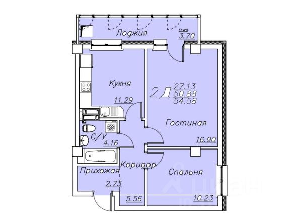 Общая площадь — 54,58 кв.м. Предчистовая отделка.