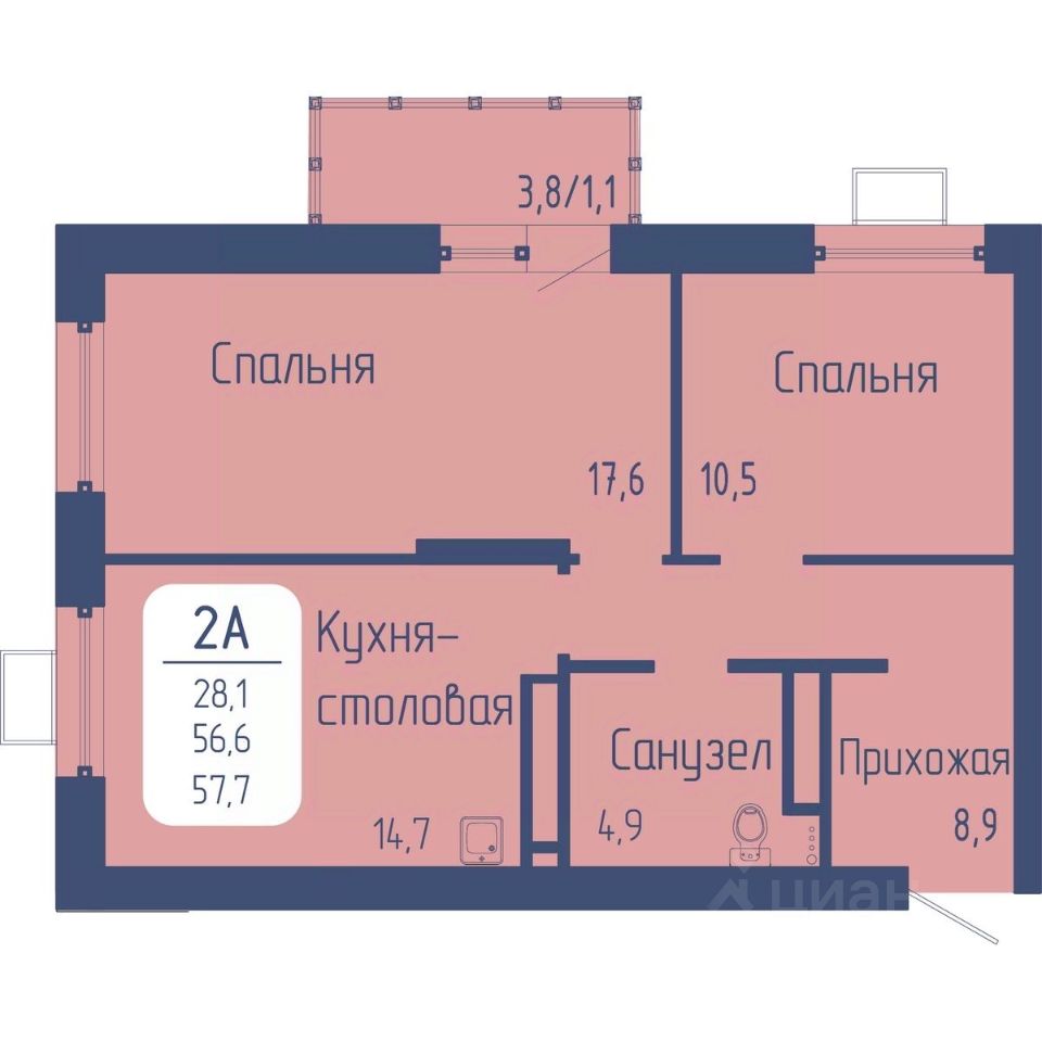Общая площадь57,7 м2