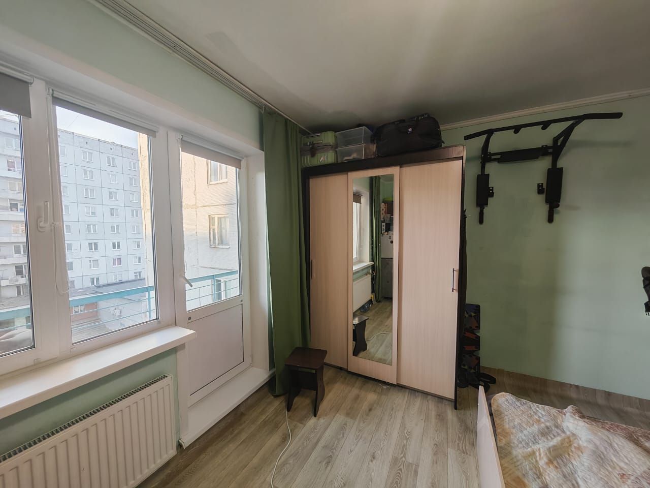 Хорошая комната с балконом, санузел на две комнаты, спокойные соседи, в комнате остается мебель: холодильник, большая кровать, шкафы для одежды, стиральная машинка. Рядом находится красивый парк, детская и спортивная площадки, школа, детсад, магазины.