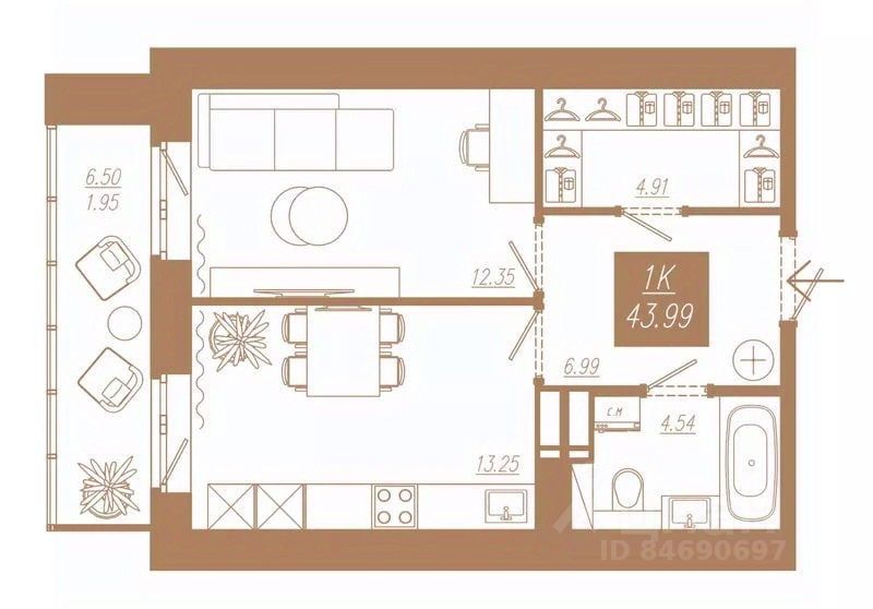Продаётся 1-комнатная квартира в строящемся доме (Дом 3), срок сдачи: II-кв. 2028, общей площадью 43.99 кв.м., на 9 этаже. Новый жилой комплекс ''АйвазовSKY'' от группы компаний ''Ментал-Плюс'' расположен по адресу: г. Красноярск, по ул. 3-я Краснодарская.