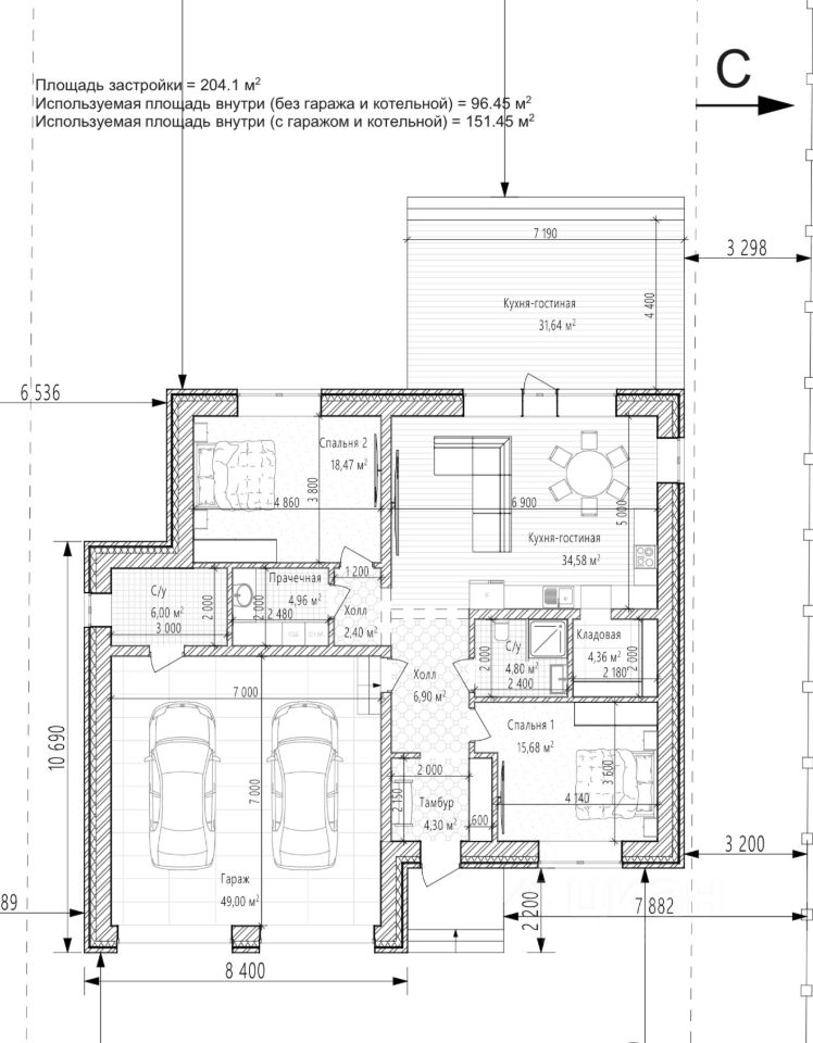 Основные характеристики дома: • Фундамент: надежные буронабивные сваи • Плита по ростверку: 200 мм, обеспечивающая прочность и долговечность • Утепление плиты: 100 мм, что гарантирует комфортную температуру в любое время года • Стены: 250 мм кирпич с утеплением 100 мм и облицовкой из кирпича 100 мм — отличный выбор для защиты от холода и шума • Кровля: плита 200 мм с утеплением 200 мм, что обеспечивает надежную защиту от погодных условий • Электричество: мощность 15 кВт, что позволит подключить все необходимые бытовые приборы • Водоснабжение: центральное, что избавляет от необходимости беспокоиться о водоснабжении