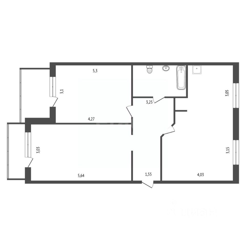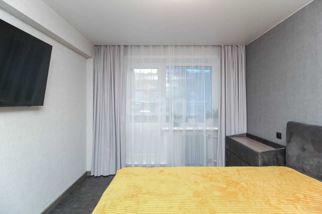 Две изолированные спальни с балконом и застекленной лоджией, а также объединенное пространство кухни-гостиной.