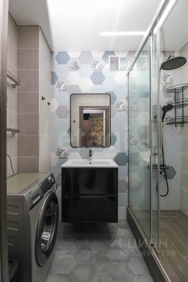 Санузел отделан керамогранитом и оснащен современной душевой. В квартире остается: кухонный гарнитур, диван в гостиной, встроенные шкафы в спальне и прихожей, что позволяет заехать без дополнительных затрат.