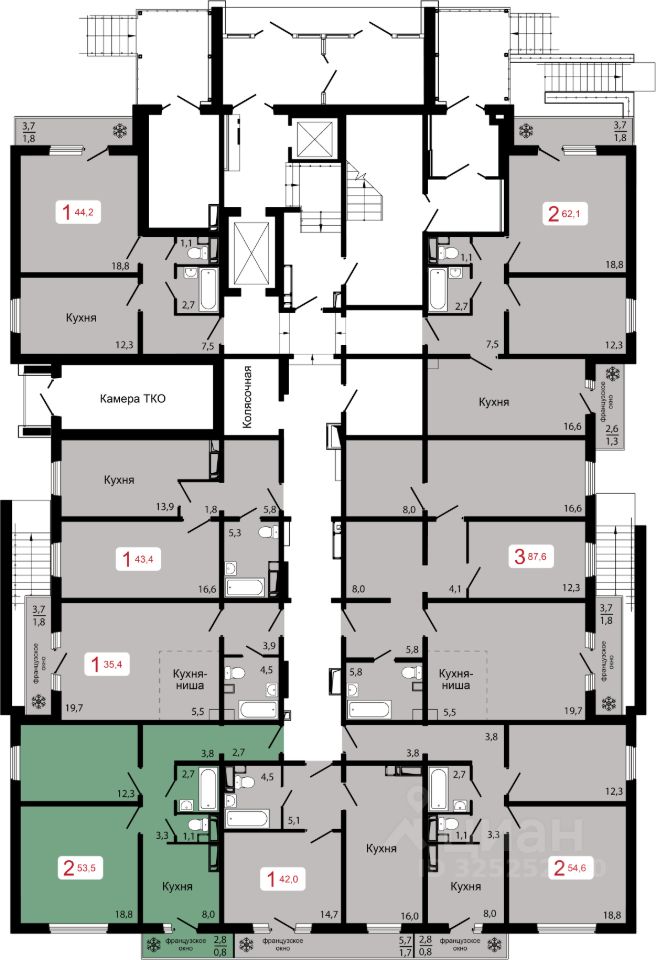 Продаётся 2-комнатная квартира в строящемся доме (Дом 3), срок сдачи: II-кв. 2027, общей площадью 53.5 кв.м., на 1 этаже.