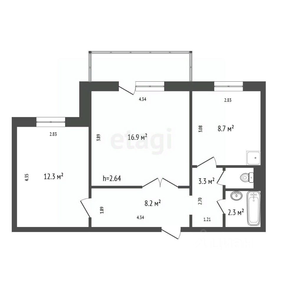 Классическая удобная планировка. Комнаты по 12,3 и 16,9 кв.м., кухня квадратной формы 8,7 кв.м., широкая прихожая с местом под шкаф-гардеробную, раздельный санузел в кафеле.
