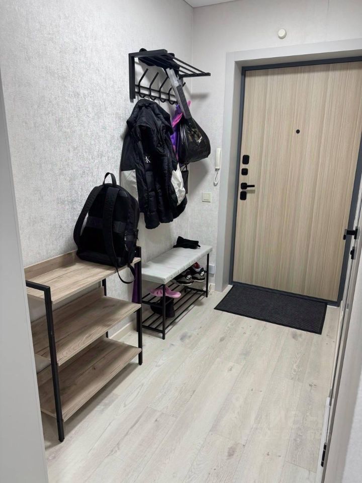 В прихожей вешалка, полка под обувь, комод.