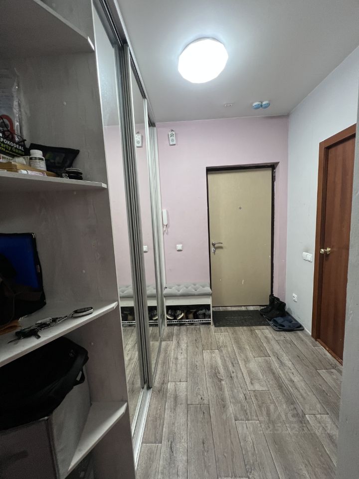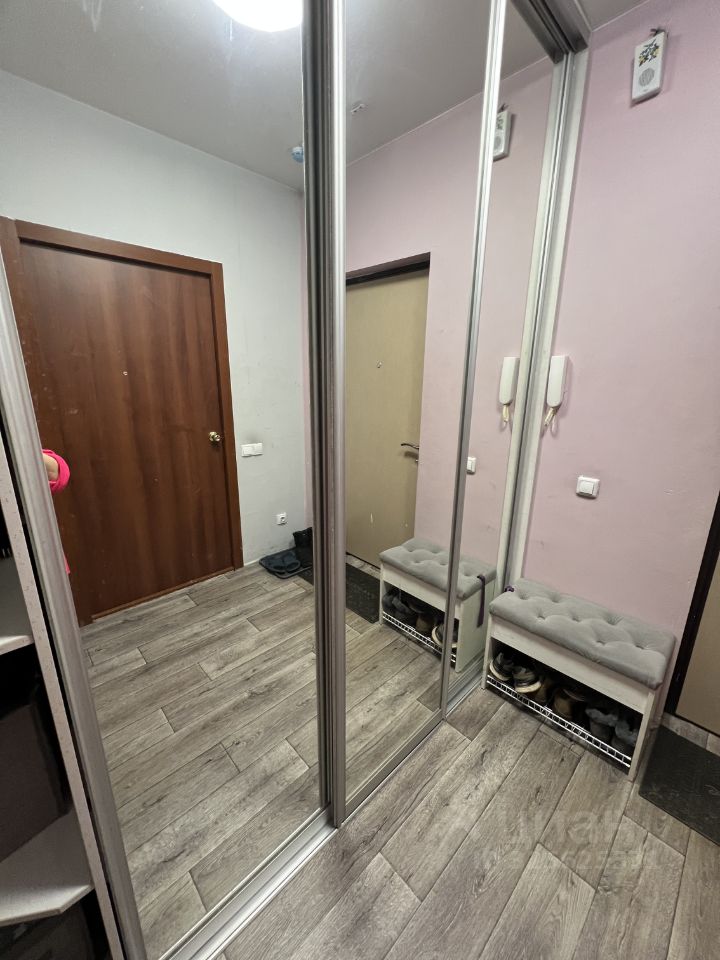 Встроенный зеркальный шкаф, пуфик с полкой для обуви.