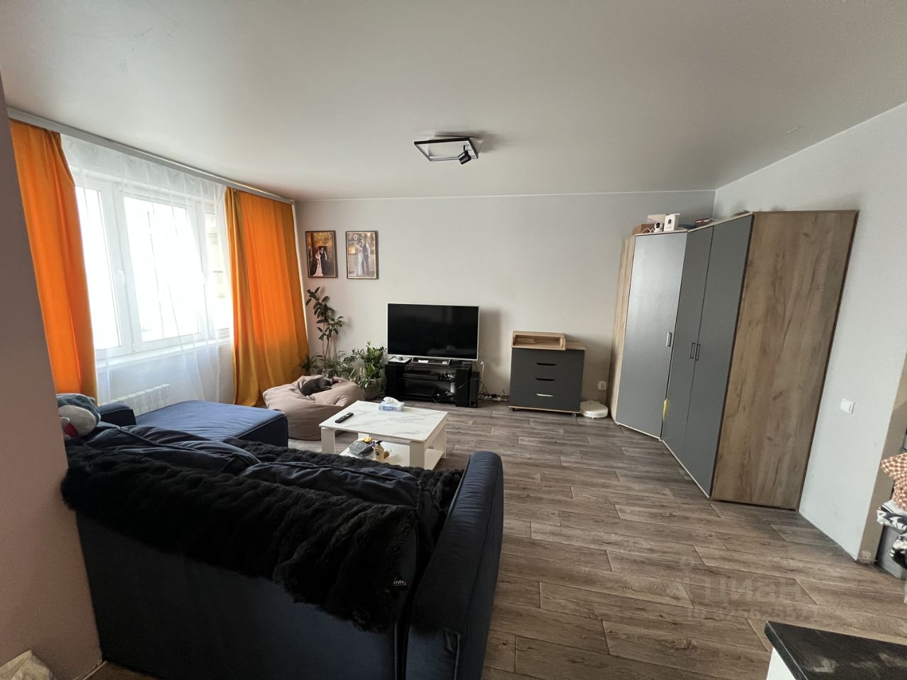Диван-кровать, большой телевизор, тумба под ТВ, шкаф, кондиционер.