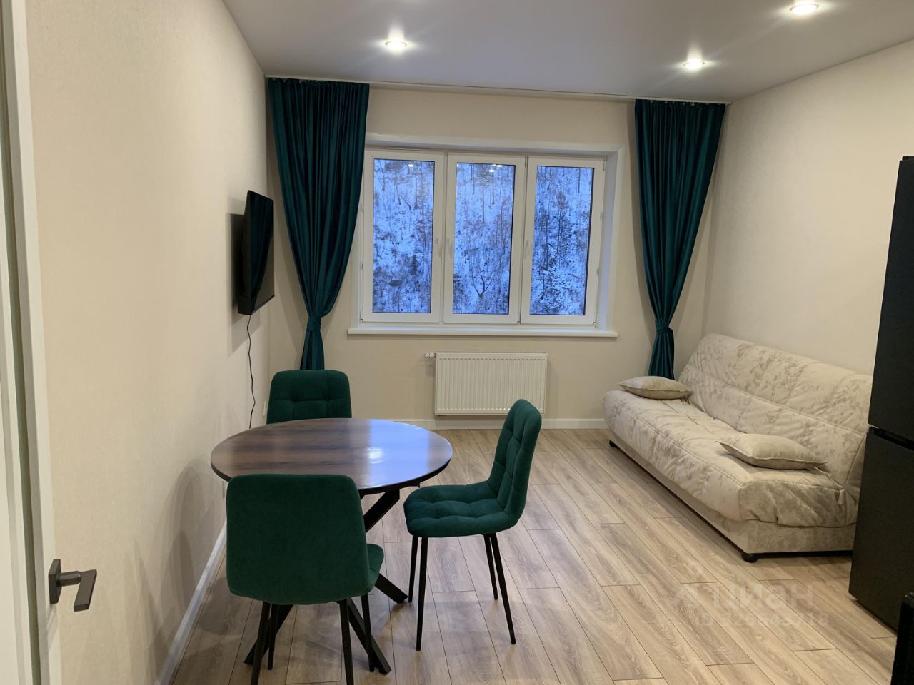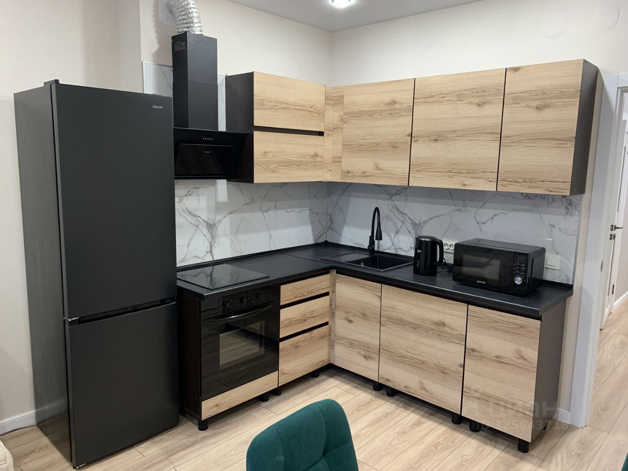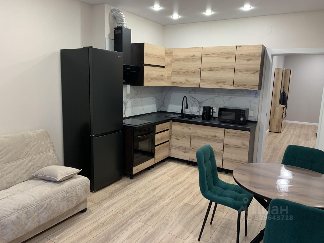 Квартира с хорошим ремонтом, комнаты изолированные. Просторная кухня - гостиная площадью 18 м² оснащена всей необходимой техникой и мебелью: кухонный гарнитур, стол, стулья, холодильник, плита, микроволновая печь, духовой шкаф, вытяжка, чайник, установлен телевизор и удобный диван.