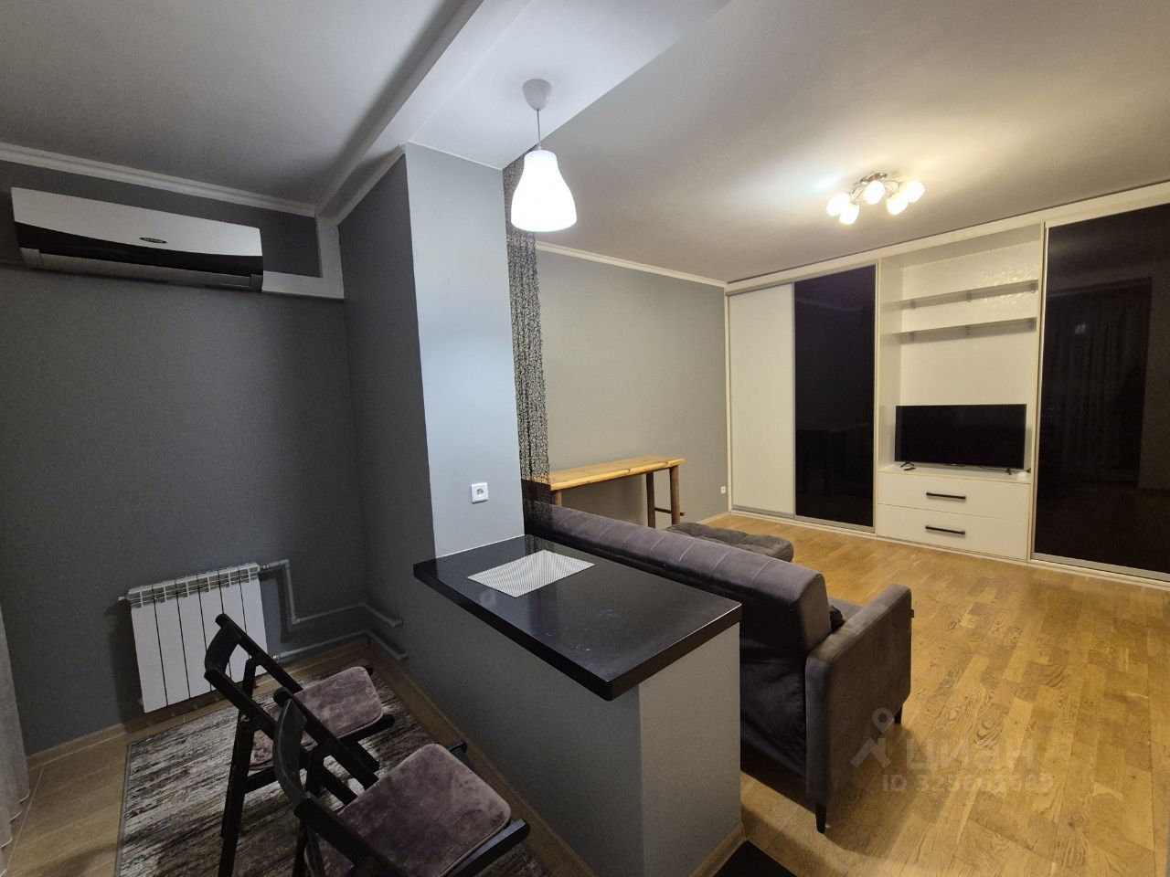 В гостиной зоне НОВЫЙ диван, кондиционер, телевизор и большой шкаф.