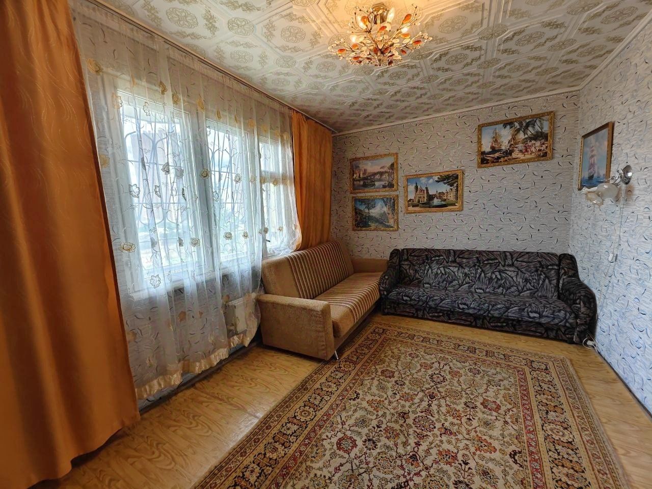 В квартире есть практически все, что нужно. Много спальных мест, упакованная кухня с бытовой техникой. Квартира на первом этаже, но окна находятся высоко над землей и выходят на палисадник, там где никто не ходит.