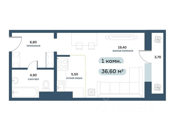 Общая площадь-36,9 кв.м., кухня ниша 5,50 кв.м.,жилая комната 19,40 кв.м.