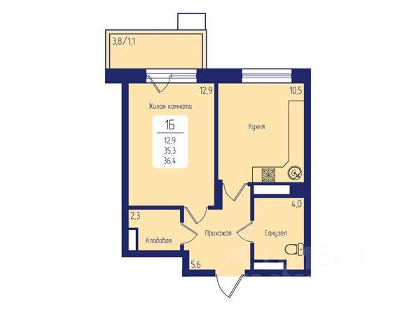 Общая площадь квартиры 36,4 кв.м., жилая-12,9 кв.м., кухня-10,5 кв.м.