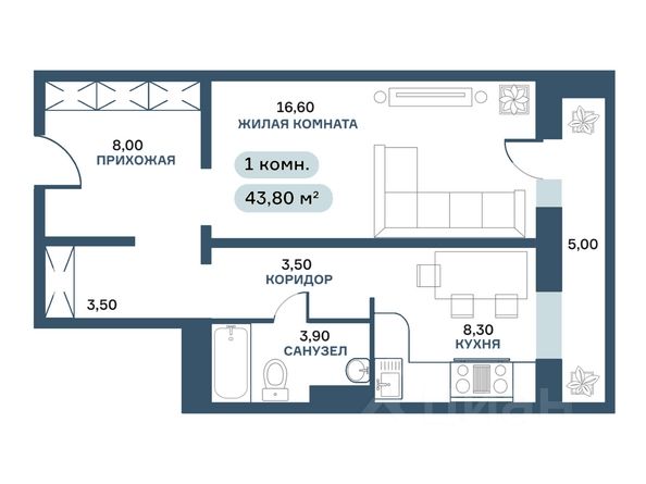 Общая площадь квартиры — 45,9 (43,8)кв.м., , жилая-16,6кв.м., кухня-8,3кв.м.