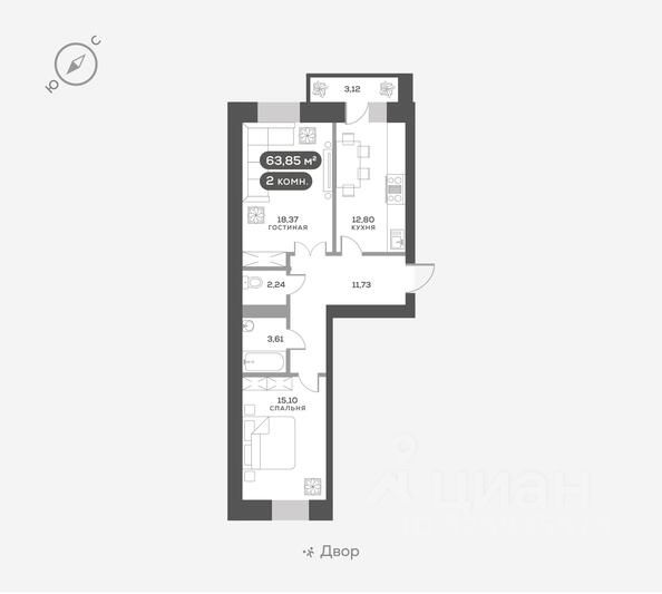 Общая площадь квартиры — 63,25 кв.м. Тип дома — кирпичный. Компания-застройщик — СМ.СИТИ.