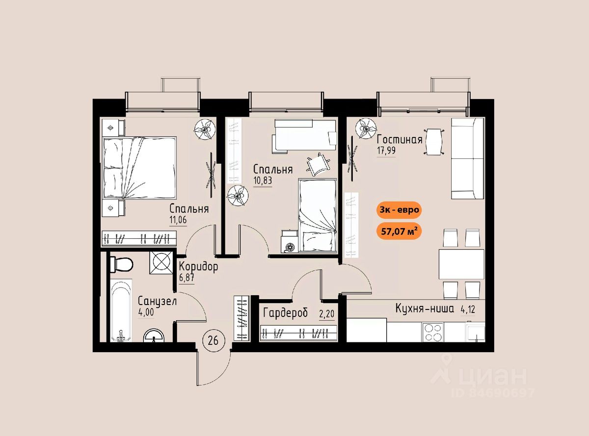 Продаётся 3-комнатная квартира в строящемся доме (Премьер парк), срок сдачи: III-кв. 2029, общей площадью 57.07 кв.м., на 12 этаже. Жилой комплекс ''Премьер Парк'' расположен в живописном микрорайоне Тихие Зори города Красноярска, неподалеку от реки Енисей и знаменитого железнодорожного моста, удостоенного гран-при наравне с Эйфелевой башней. Вблизи комплекса находятся такие достопримечательности, как фан-парк ''Бобровый Лог'', заповедник ''Столбы'' и река Базаиха с её живописной поймой. Чтобы провести время на природе понадобиться потратить всего несколько минут на дорогу. Преимущества близкого расположения к заповеднику ''Столбы'' и фан-парку ''Бобровый Лог'' делают ''Премьер Парк'' идеальным выбором для тех, кто ценит активный и здоровый образ жизни, природу и удобства современной инфраструктуры. Жители могут легко сочетать городской комфорт с активным отдыхом на природе, наслаждаясь лучшими из обоих миров. Развитая транспортная инфраструктура позволяет добраться до центра города всего за 10 минут. Кроме того, рядом расположен спортивно-зрелищный центр ''Платинум Арена'', принимающий большое количество развлекательных и спортивных мероприятий различного масштаба. Около 2000 тысяч квадратных метров займёт ритейл с нежилыми помещениями , в которых разместяться магазины, кафе, рестораны, кофейни.Что избавит жителей жилого комплекса от необходимости лишний покидать территорию своего дома. Первая очередь строительства жилого комплекса ''Премьер Парк'' ознаменует начало создания нового уникального микрорайона с современной архитектурой и особым подходом к комфортному и гармоничному проживанию. Одной из архитектурных особенностей комплекса станет дом, построенный на стилобате, на котором будет размещено благоустройство. Архитектурным акцентом станет арка, соединяющая секции дома между собой. Квартиры с просторными террасами на верхних и первых этажах обеспечат отличное времяпрепровождение для всей семьи, а также будут доступны террасы общего пользования, которые будут располагаться на переходных секциях, 7 этажах. Вообразите себе уютное утро, когда вы выходите на просторную террасу с чашкой горячего кофе. С высоты открывается захватывающий вид на могущественный Енисей, железнодорожный мост и живописные окрестности. Вечером терраса становится идеальным местом для отдыха с семьей или друзьями. Здесь можно наслаждаться живописными закатами, которые окрашивают небо в невероятные оттенки оранжевого и розового, создавая атмосферу уюта и спокойствия. Для всех жителей комплекса предусмтрен бесплатный фитнес-зал, что позволит поддерживать здоровый образ жизни и укреплять здоровье, не покидая пределы жилого комплекса. Входные группы ЖК ''Премьер парк'' два общих входа для жителей всего дома , в которых будут располагаться детские игровые комнаты, зоны отдыха для деловых переговоров и соседких бесед. Дополнительно вход в подъезд предусмотрен в каждой жилой секции, в которых предусмотрены комнаты для хранения велосипедов и колясок. Благодаря подземной парковке, назем