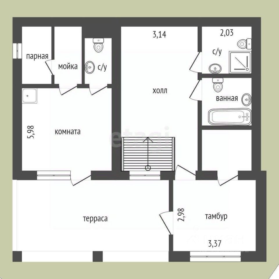 На первом этаже расположены: -помещение санузла -техническое помещение с коммуникациями -помещение для сауны, либо гостевая комната -холл с местом под гардеробную. -большая терраса (проектом предполагается террасу закрыть, получив подобие лоджии)