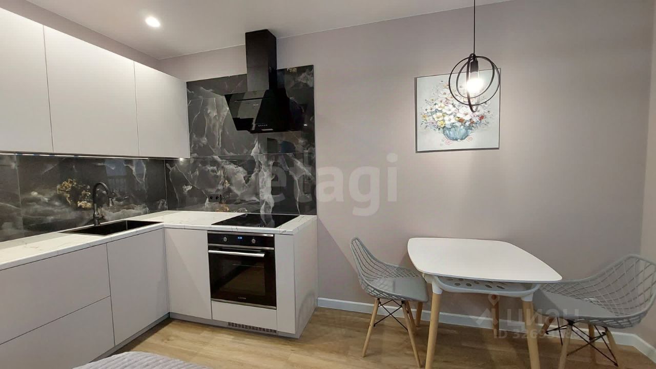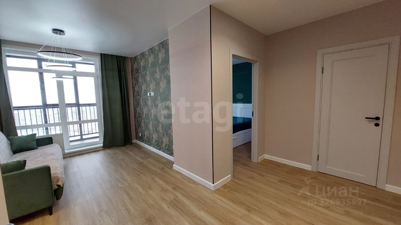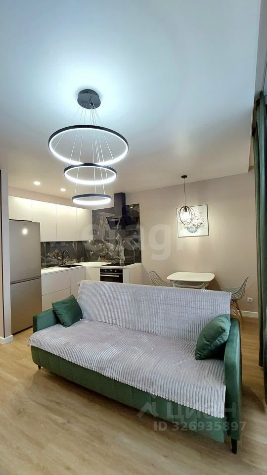 Дом сдался в эксплуатацию полгода назад, а ремонт в квартире только завершился, так что вас ожидает чистое и новое жильё. Ремонт выполнен в спокойных светло-зелёных тонах. На кухне, совмещённой с жилой комнатой, установлен кухонный гарнитур, электрическая плита с духовым шкафом, холодильник, обеденный стол со стульями и диван. Во второй жилой комнате находится двуспальная кровать и комод. В прихожей зоне стоит большой шкаф. По надобности можно довезти автоматическую стиральную машинку. Также есть отдельная гардеробная.