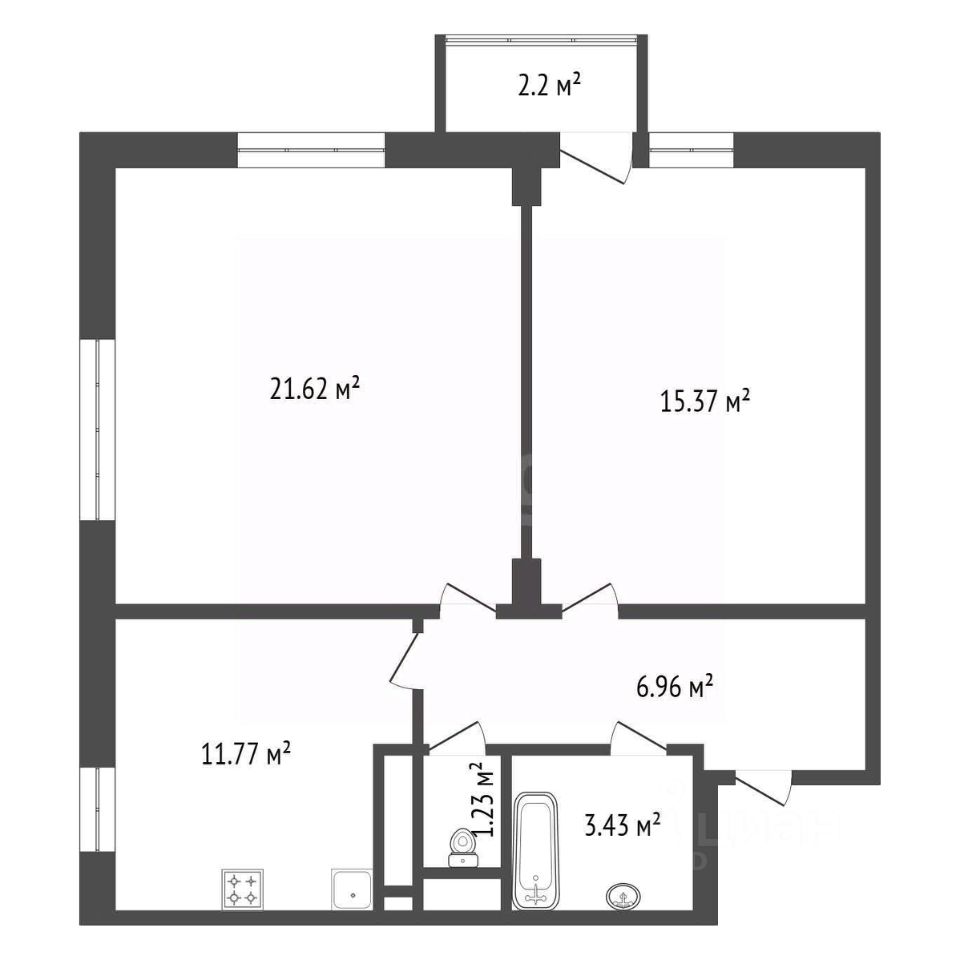 Общая площадь 61.4 м², просторная кухня почти 12 м². Комнаты правильной формы, легко расставить мебель.