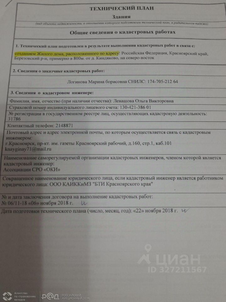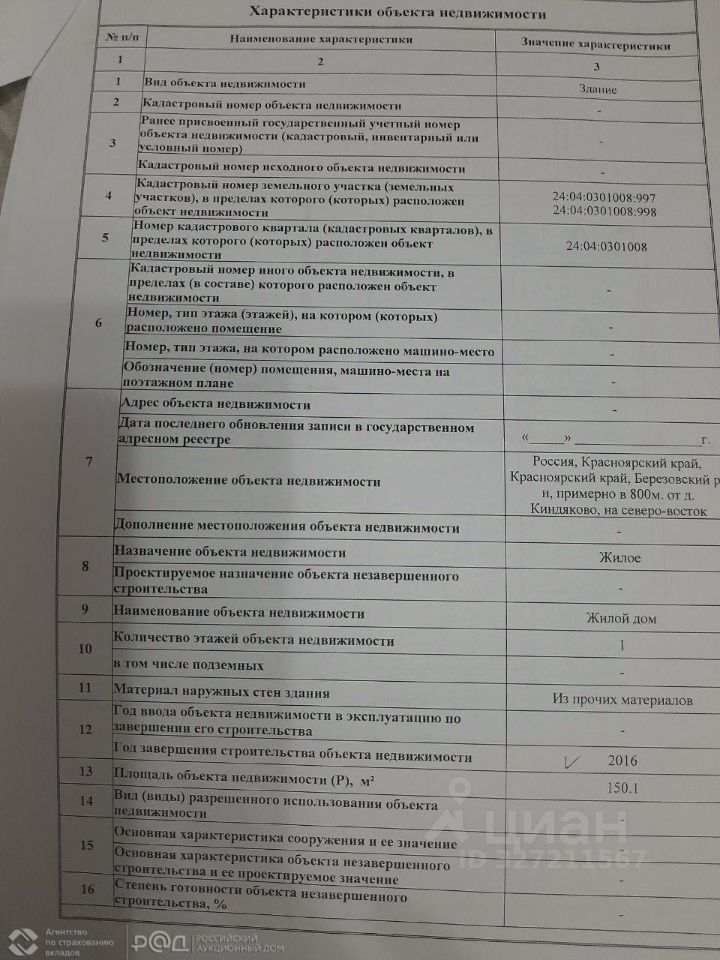 Код лота: РАД-444844. Реализуется на торгах. АО ''Российский аукционный дом'' сообщает о проведении аукциона по продаже имущества банкрота: Объект: земельный участок Категория: земли сельскохозяйственного назначения, Площадь: 810 кв. м, Кадастровый номер: 24:04:0301008:998, Адрес: Красноярский край, Березовский район, 800 м. от д. Киндяково Объект: земельный участок Категория: земли сельскохозяйственного назначения, Площадь: 833 кв. м, Кадастровый номер: 24:04:0301008:997, Адрес: Красноярский край, Березовский район, 800 м. от д. Киндяково Объект: жилой дом Кадастровый номер: 24:04:0301008:3706, Площадь: 150, 1 кв. м, Адрес: Красноярский край, Березовский район, примерно в 800 м. от д. Киндяково, на северо-восток. https://catalog. lot-online. ru/index. php?dispatch=products. view&product_id=1595324