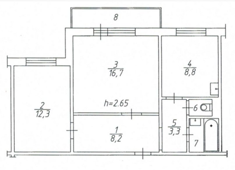 Планировка с раздельными комнатами 16,7 и 12,3 кв метров, просторной кухней 8,8 кв метров и раздельным санузлом.