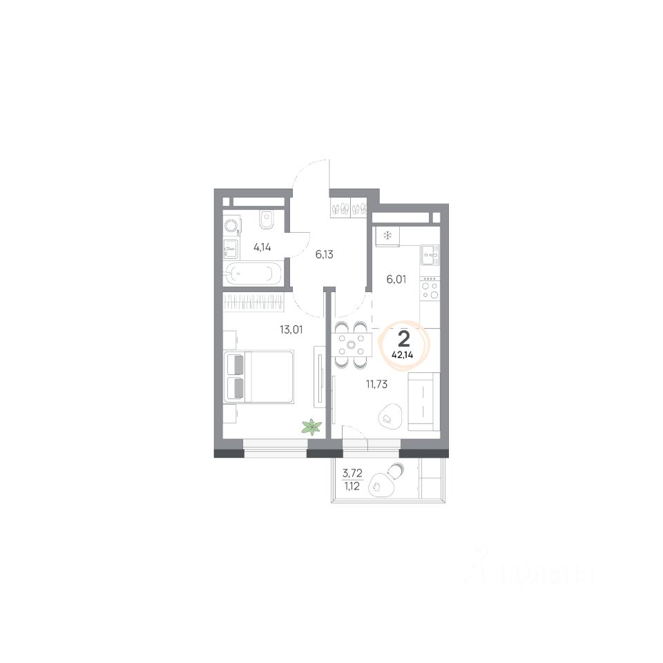 2-комнатная квартира, 42.14кв.м., 3 этаж